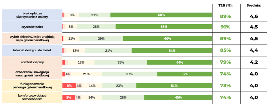 Badania Omnisense zrealizowanego na zlecenie Związku Polskich Pracodawców Handlu i Usług (ZPPHiU) i Polskiego Stowarzyszenia Najemców Powierzchni Handlowych (PSNPH)potwierdziły, że najważniejsze kwestie dla klientów odwiedzających centra handlowe to: czystość toalet (91% wskazań) i brak opłat za nie (89%), łatwość dostępu do toalet (85%), wybór sklepów w galerii handlowej (89%), komfort cieplny (79%), oznaczenia i nawigacja w obiekcie (74%), funkcjonowanie parkingu (73%) oraz łatwy dojazd samochodem (74%). Nieistotne natomiast są takie elementy, jak: rodzaj posadzek w sklepach, sposób pozyskiwania energii elektrycznej, widoczność instalacji podsufitowych czy rodzaj szkła w witrynach sklepowych.